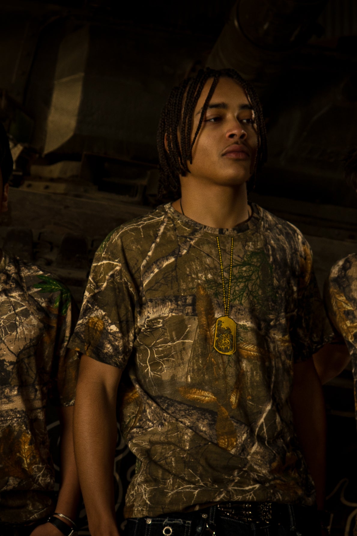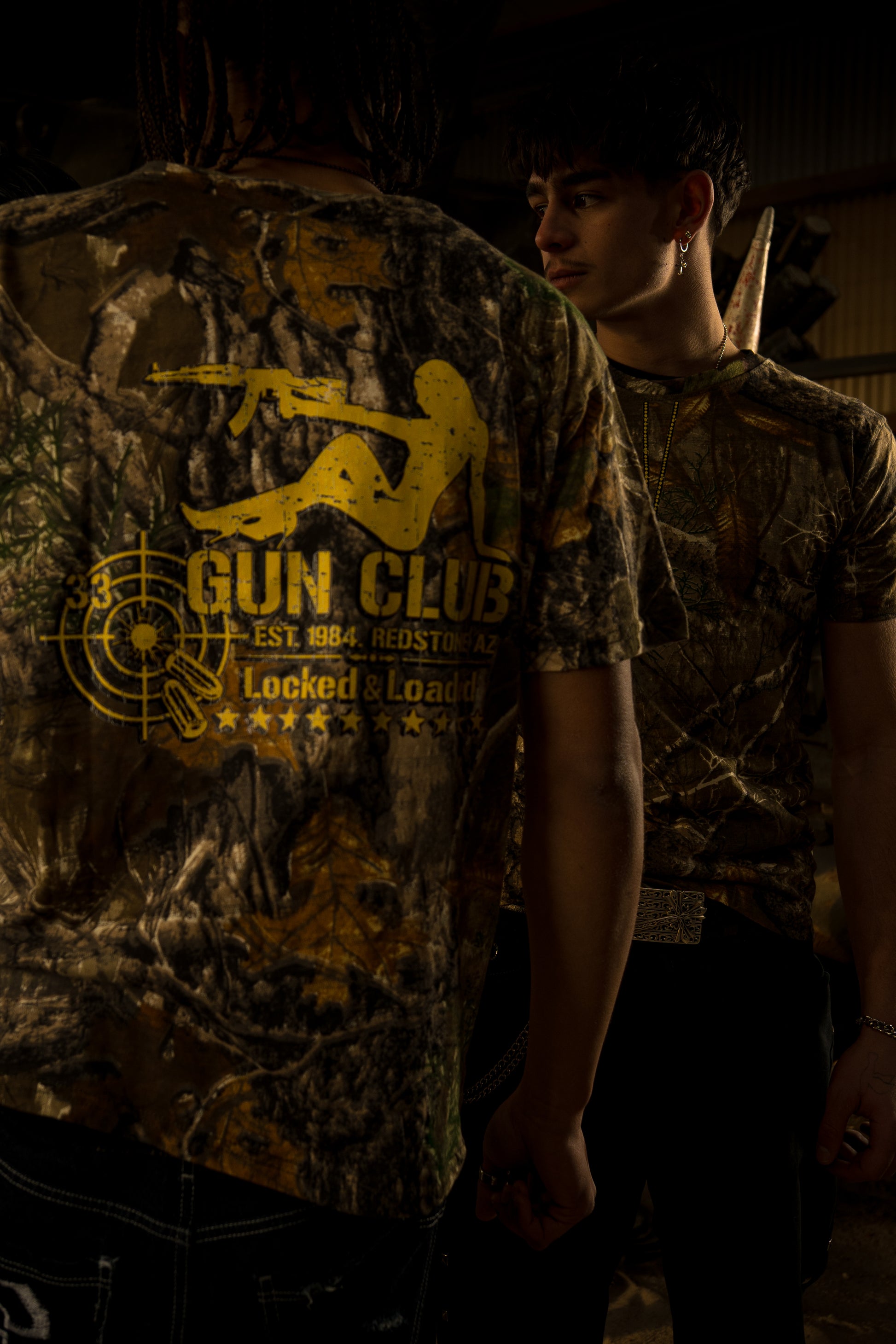 This camo tee features a DTG-printed metal dogtag graphic on the front and a full-size Gun Club artwork on the back. The shirt is fully reworked and individually heat-set.